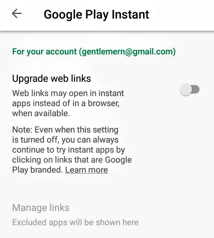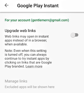 From options available, scroll down and click on “Google Play Instant” then toggle off “upgraded Web Link”